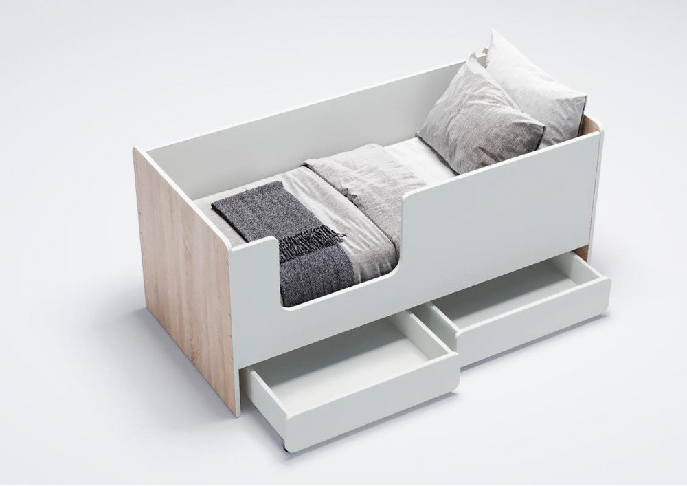Особенностью данной модели являются два вместительных выкатных ящика, которые оборудованы прямоходными колесами. Эти ящики предоставляют дополнительное пространство для хранения игрушек, одежды и прочих детских принадлежностей, а прямоходные колеса обеспечивают легкость и удобство при их выдвижении.