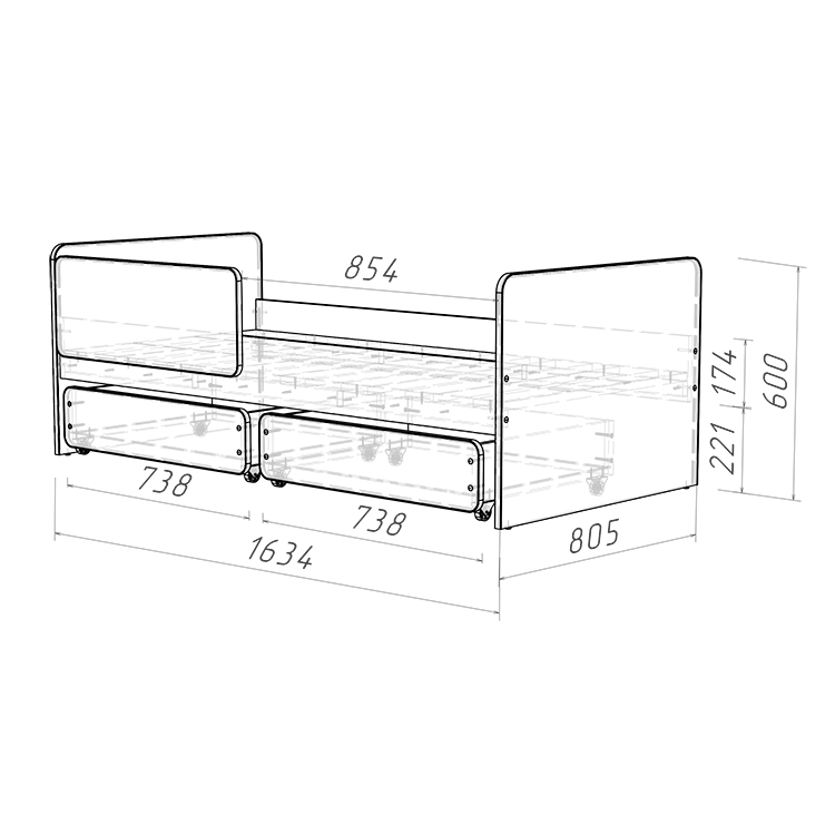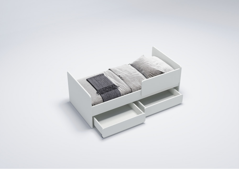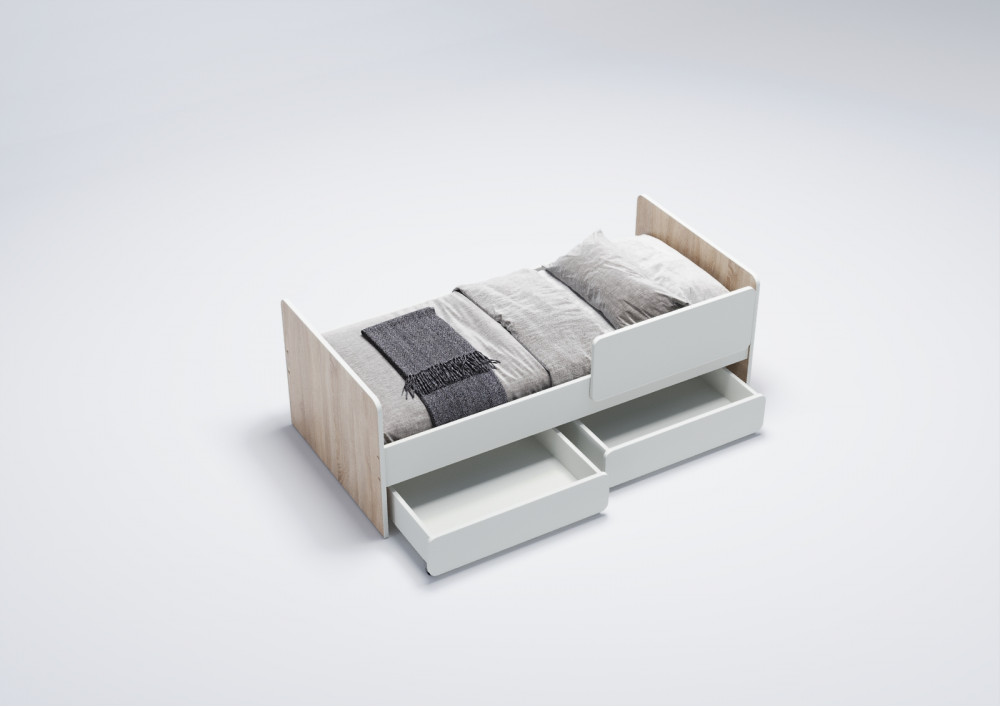 3.    Выкатные ящики: Кровать оснащена двумя выкатными вместительными ящиками, которые оборудованы прямоходными колесами для легкости использования. Это удобное решение для хранения игрушек, постельного белья или других вещей.